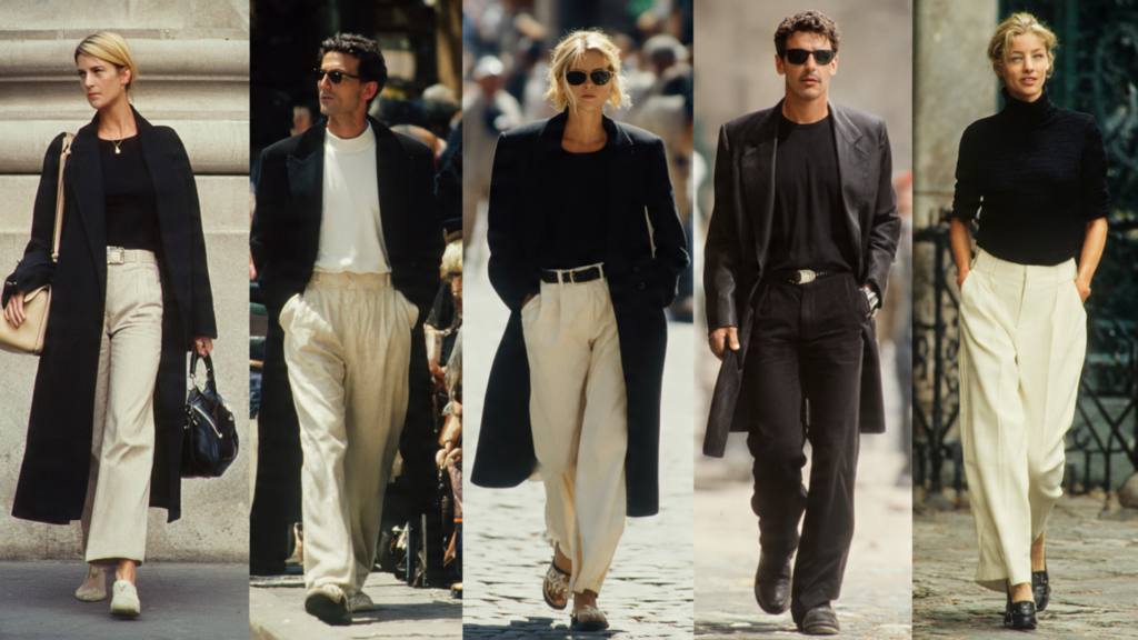 People recreate her looks today using pared-back pieces from brands like COS, Uniqlo U, Everlane, and Mango—black trousers, fitted tops, simple flats. The emphasis stays on proportion rather than decoration.