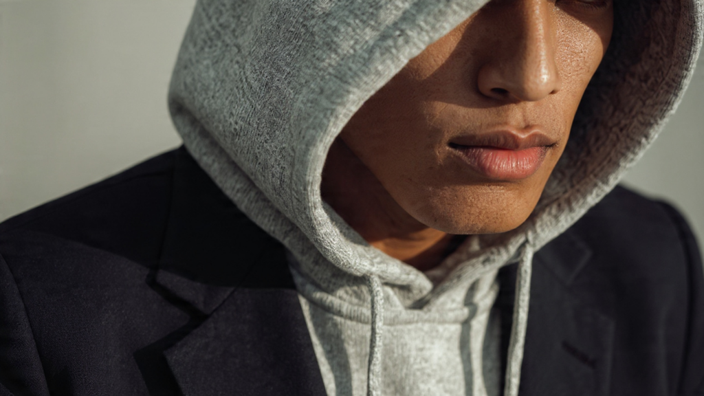 Another everyday layering choice is placing a hoodie next to something sharper. A hoodie under a tailored coat. A hoodie with straight-leg trousers. A hoodie worn with leather shoes or clean sneakers.